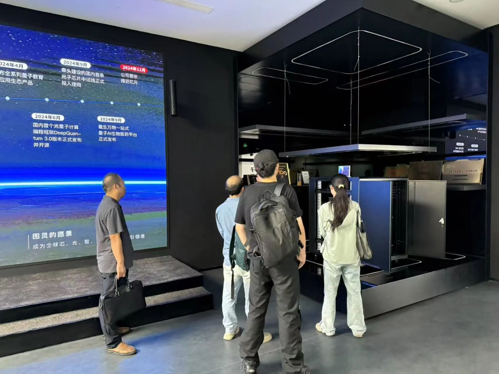 訪問(wèn)期間,郝瑞成一行參觀了圖靈智算的量子技術(shù)展示中心,詳細(xì)了解了圖靈智算在量子計(jì)算硬件、軟件及算法開發(fā)領(lǐng)域的最新進(jìn)展和戰(zhàn)略布局。郝總對(duì)圖靈智算在推動(dòng)量子計(jì)算技術(shù)產(chǎn)業(yè)化方面取得的成就表示贊賞,并介紹了礪城科技在科技信息服務(wù)、產(chǎn)教融合以及人才培養(yǎng)生態(tài)構(gòu)建方面的優(yōu)勢(shì)與經(jīng)驗(yàn)。